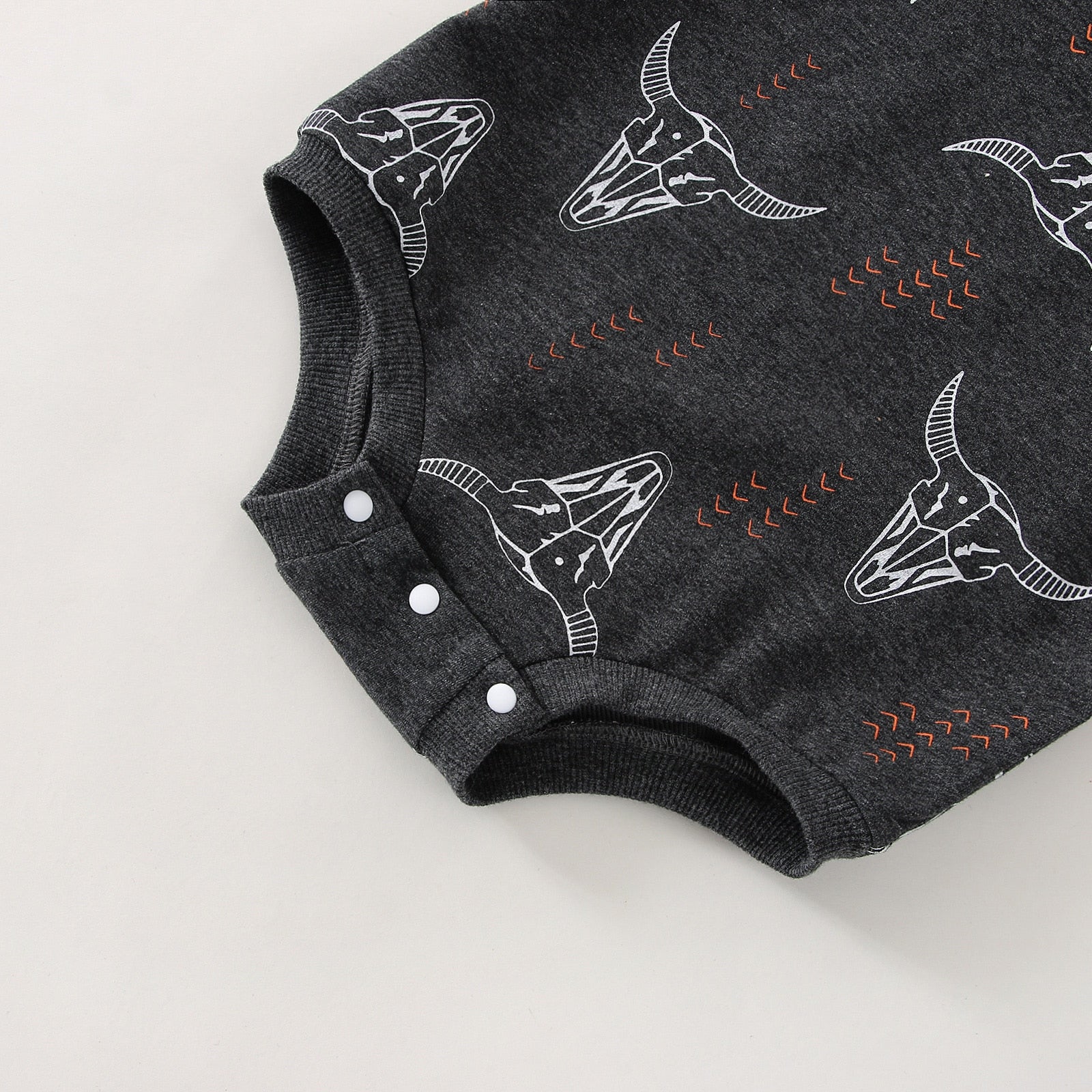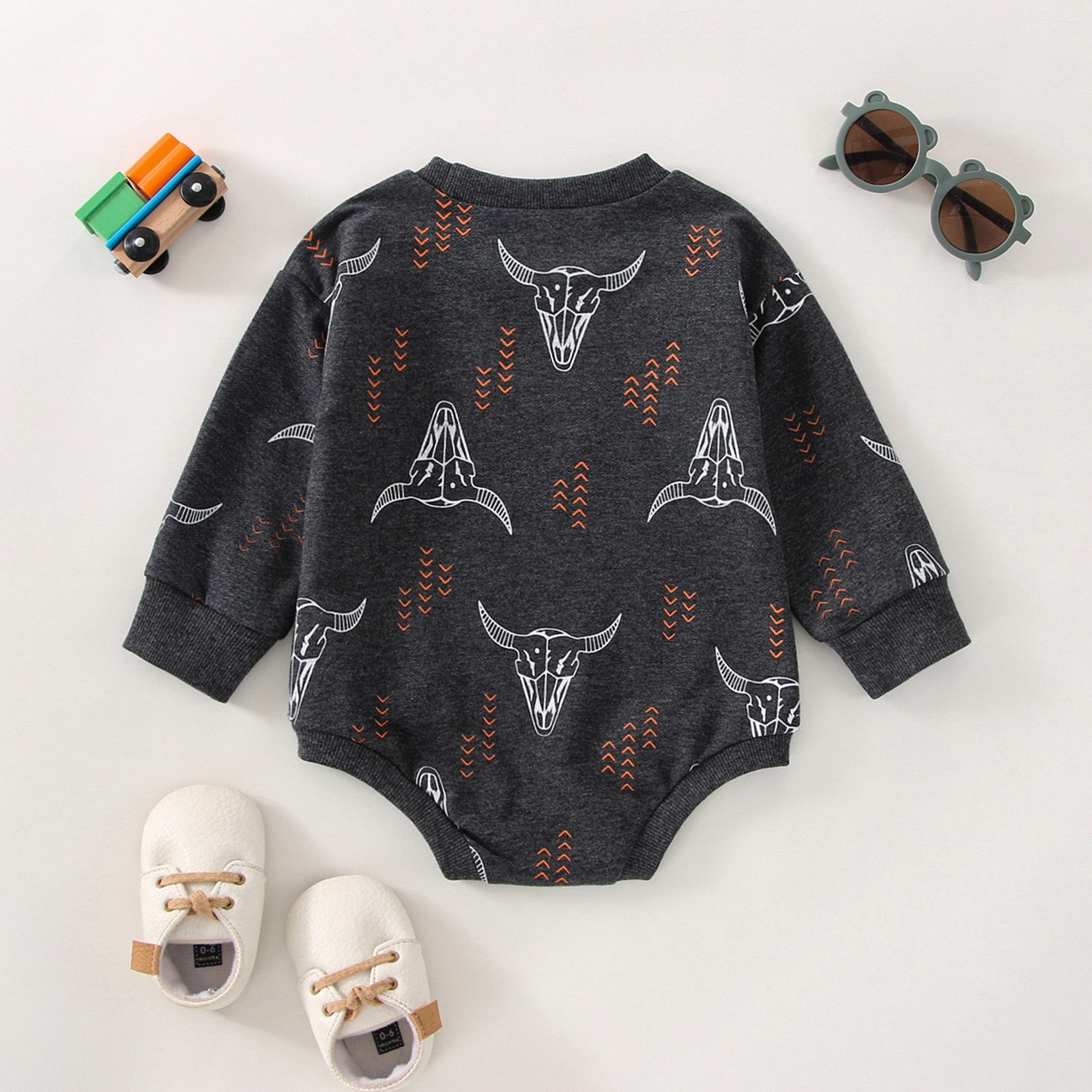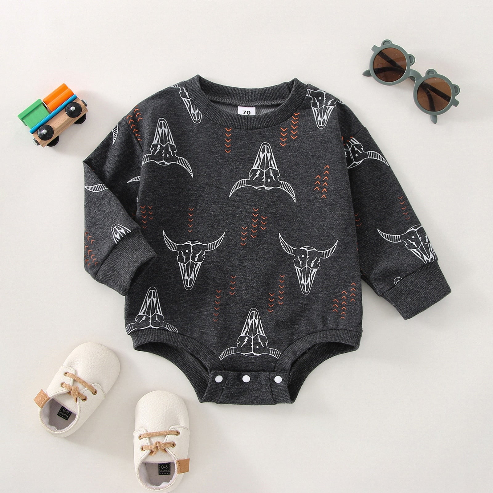 Printed tops are surely a closet staple for a very fun looking closet! This BOHO SKULL Onesie is uniquely designed for your little one to wear all day.