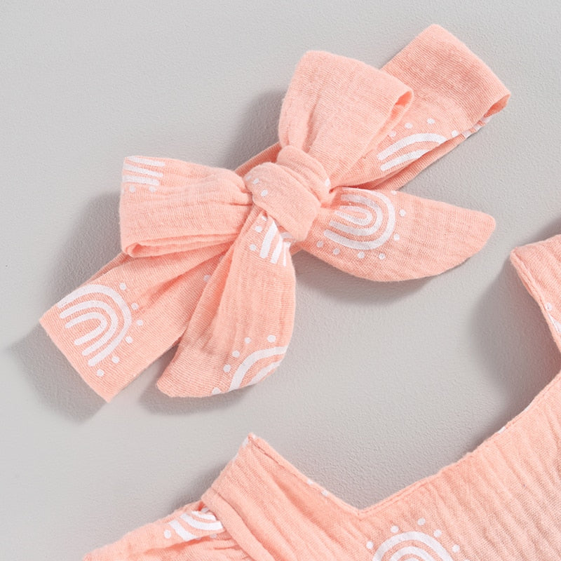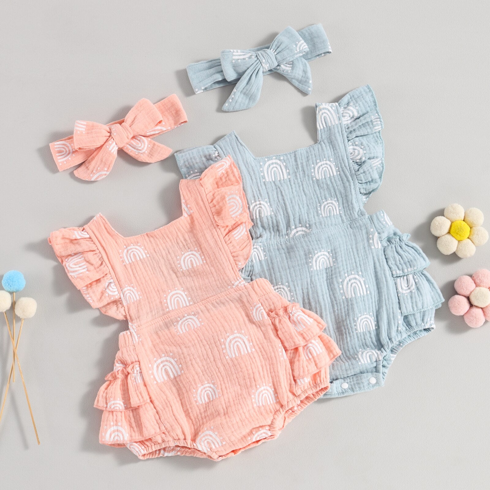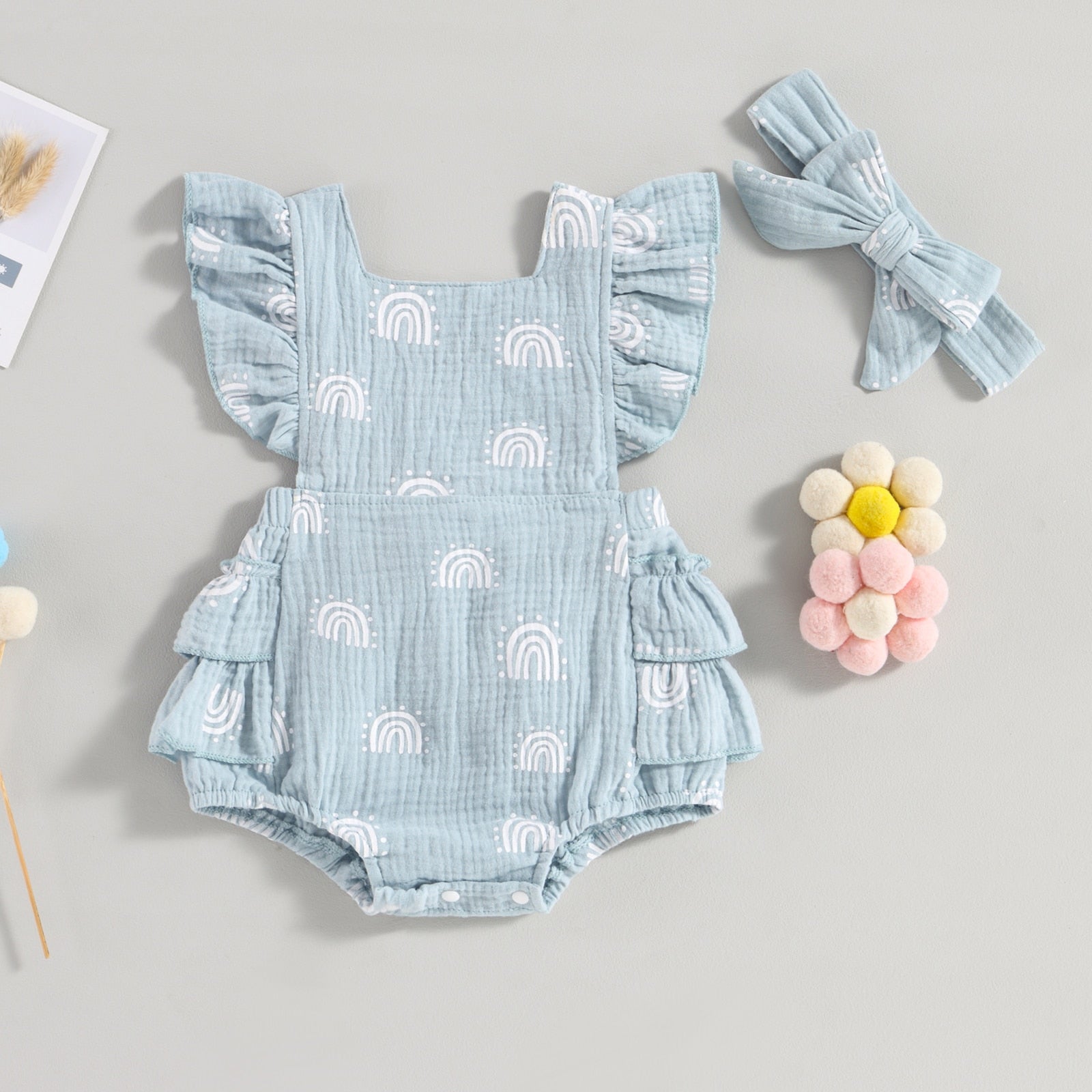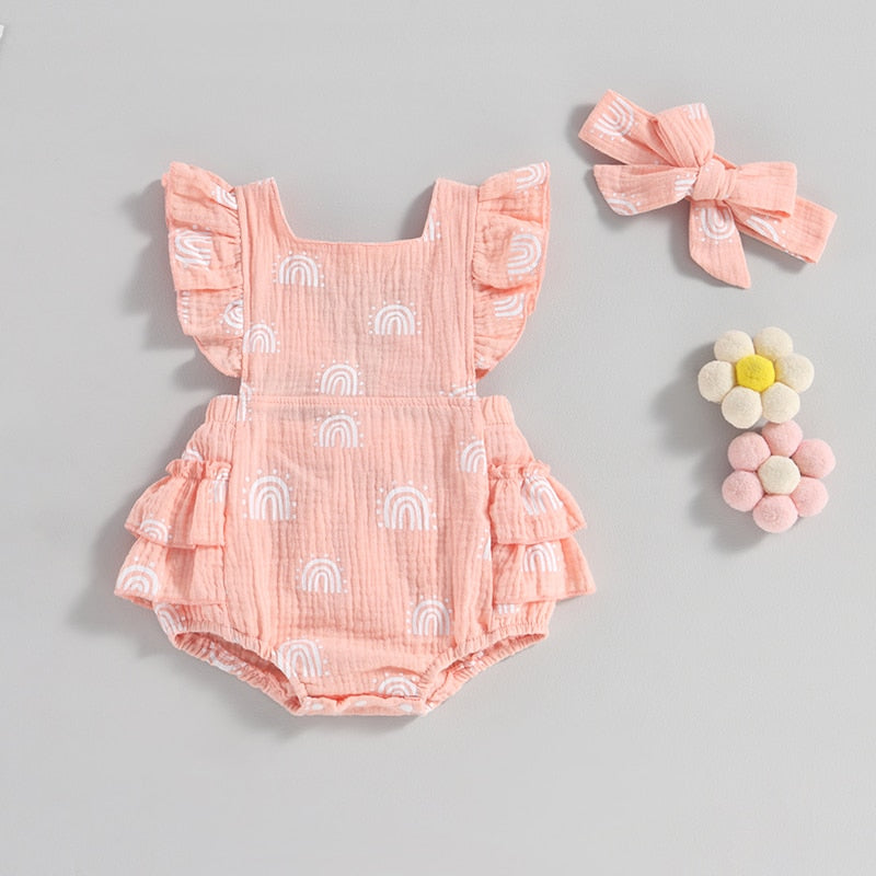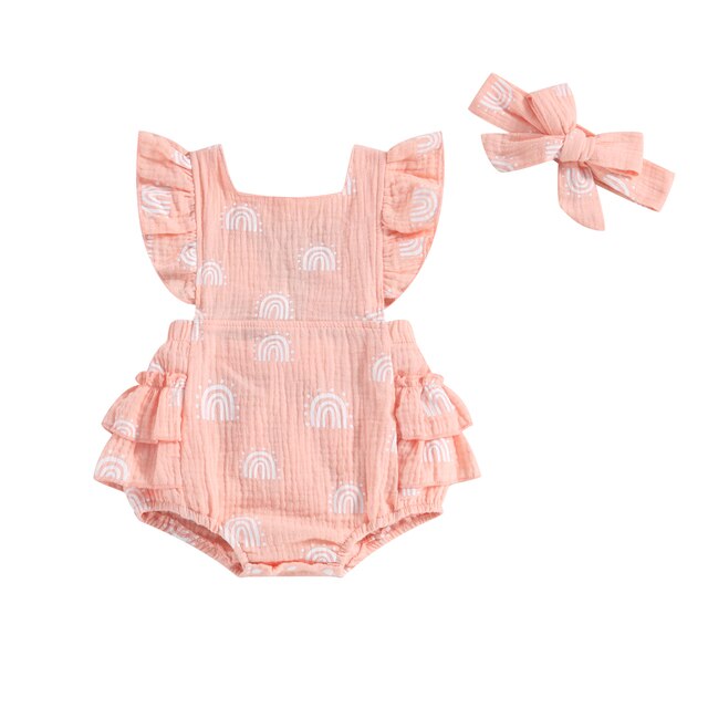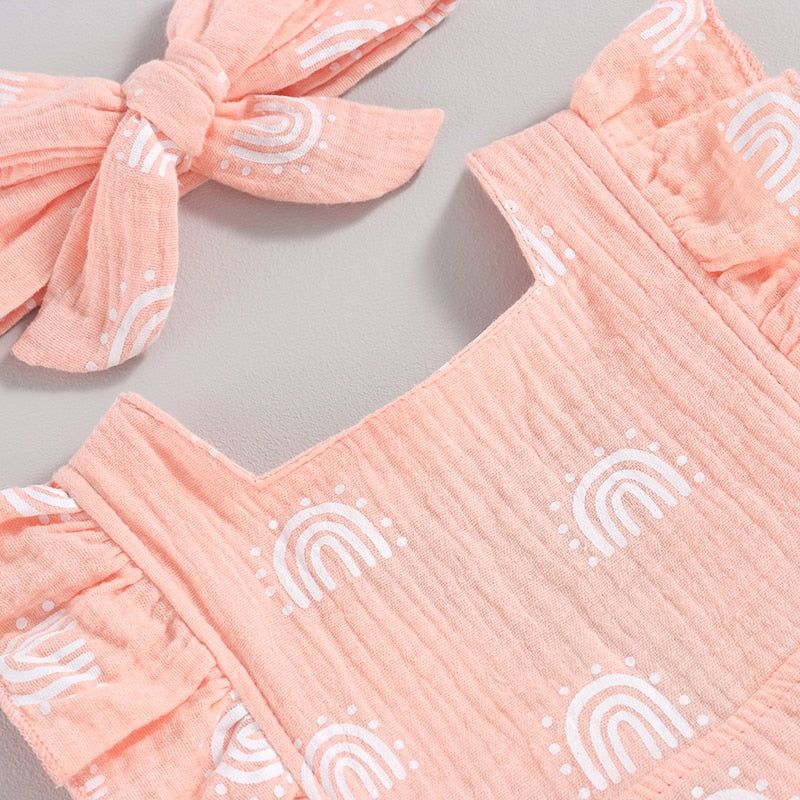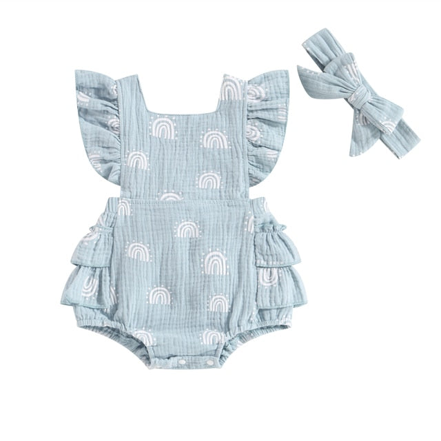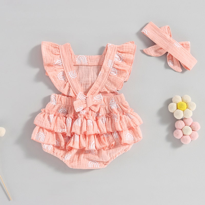 An enchanting romper available in delightful pastel colors. Boasting dainty rainbow prints, ruffled sleeves and a complementing self-tie headband, the perfect getup for your darling daughter!